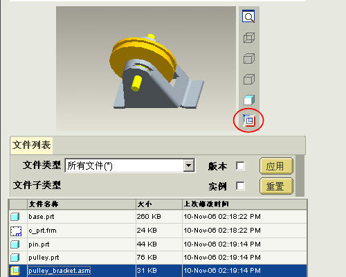 在“文件列表”(File List) 中,单击 PULLEY_BRACKET.ASM 预览零件。在预览窗口中拖动鼠标中键旋转模型。