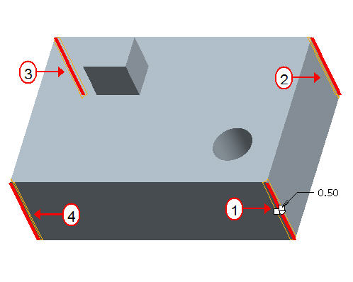 除单条边或相切边以外,用户还可选取“目的链”,以使倒圆角可根据特征选取参照,而不是根据特定图元选取。 |